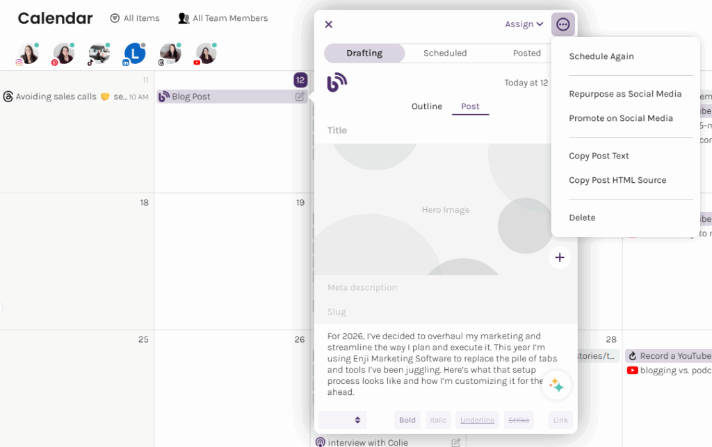 What stands out about Enji marketing software is how consolidated the workflow is. Instead of bouncing between ChatGPT, a transcription tool, a scheduling app, and a project manager, I can plan, draft, repurpose, and schedule from one place. I also like that Enji stores the drafts in case I want to revisit or rearrange them later.